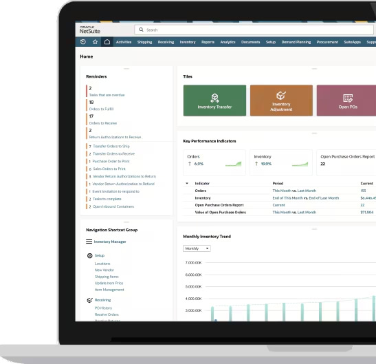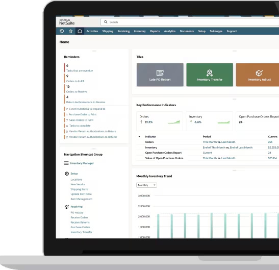 Oracle NetSuite ERP provides real-time visibility across finance, inventory, HR, and customer operations.