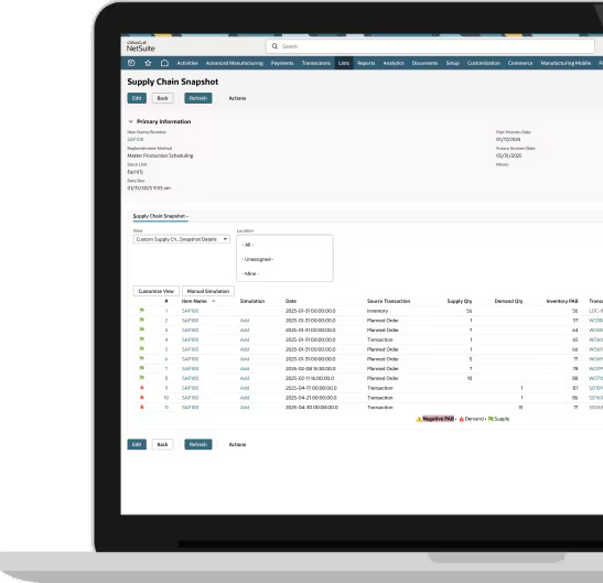 Manage the complete manufacturing lifecycle with NetSuite Manufacturing. From bill of materials (BOM) and work orders to production planning and scheduling, NetSuite improves production efficiency, cost control, and on-time delivery for manufacturing organizations.